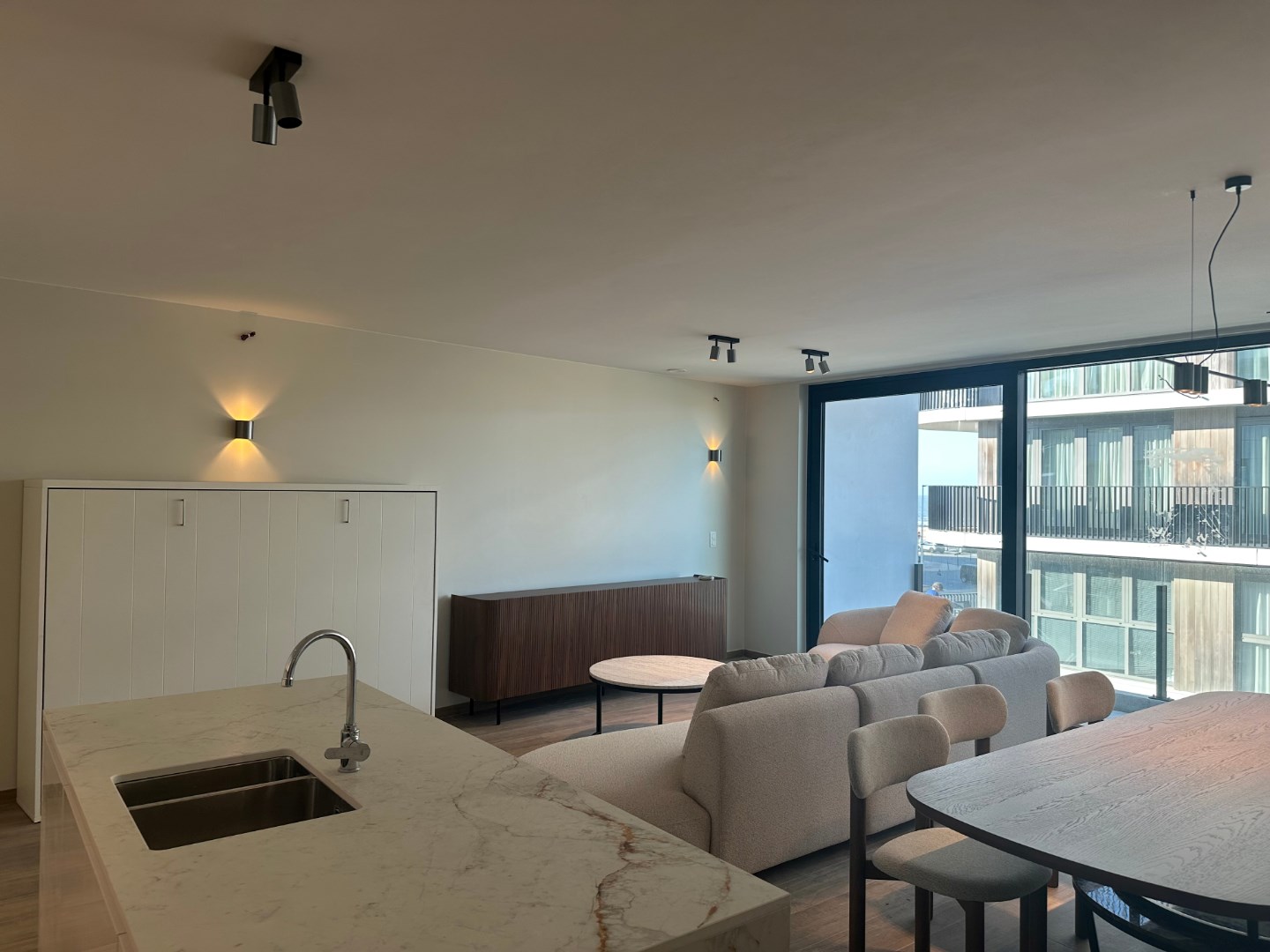 Vanop deze derde verdieping mooi lateraal zeezicht. De indeling : naast de inkomhall en het apart toilet is er een zeer grote living met royale afmetingen en met zeer veel lichtinval door z’n grote glaspartijen over de volledige hoogte en lengte van het appartement. Prachtige dure keuken met eiland afgewerkt in gloss en dure natuursteen. Zeer aangename zonneterrassen zowel voor als achter.