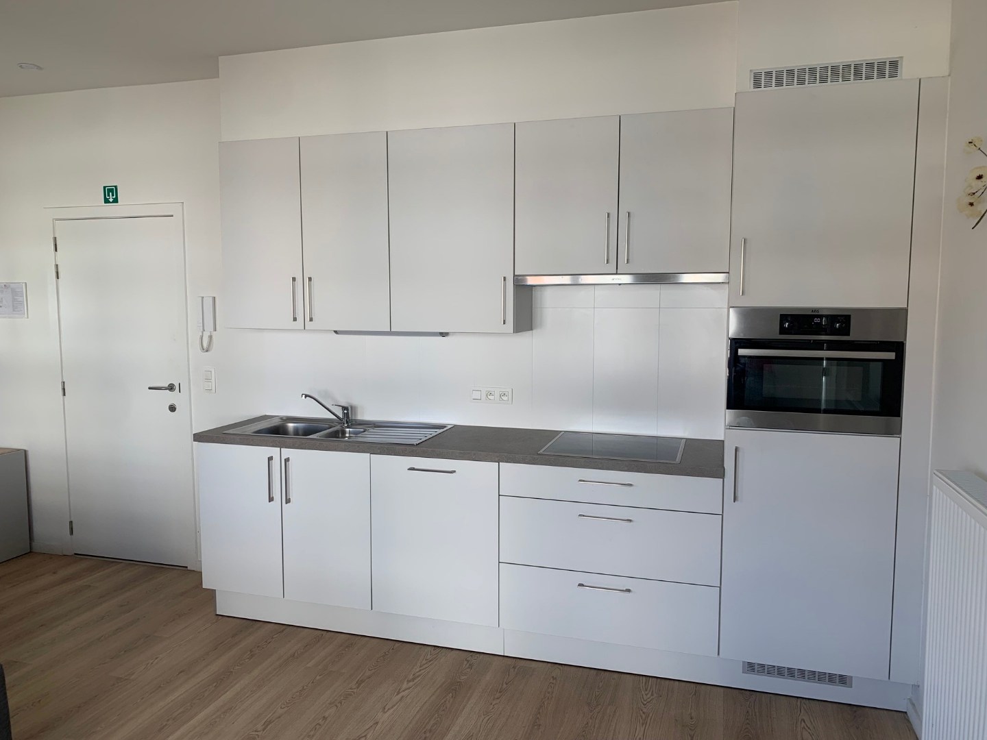 Appartement bestaat uit woonkamer met open keuken, afgesloten berging waar voorziening is voor wasmachine, badkamer met inloopdouche en toilet en één slaapkamer.