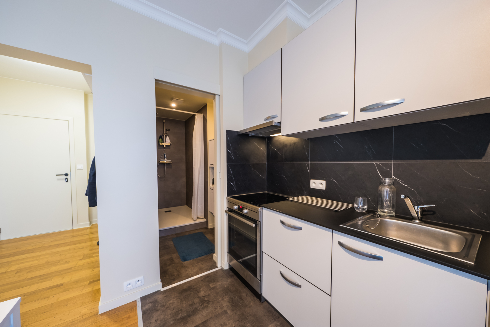 Luxueuze studio: massief eiken parket, keukentoestellen van AEG waaronder inductie kookplaat; douche in keramiek, infrarood verwarming.