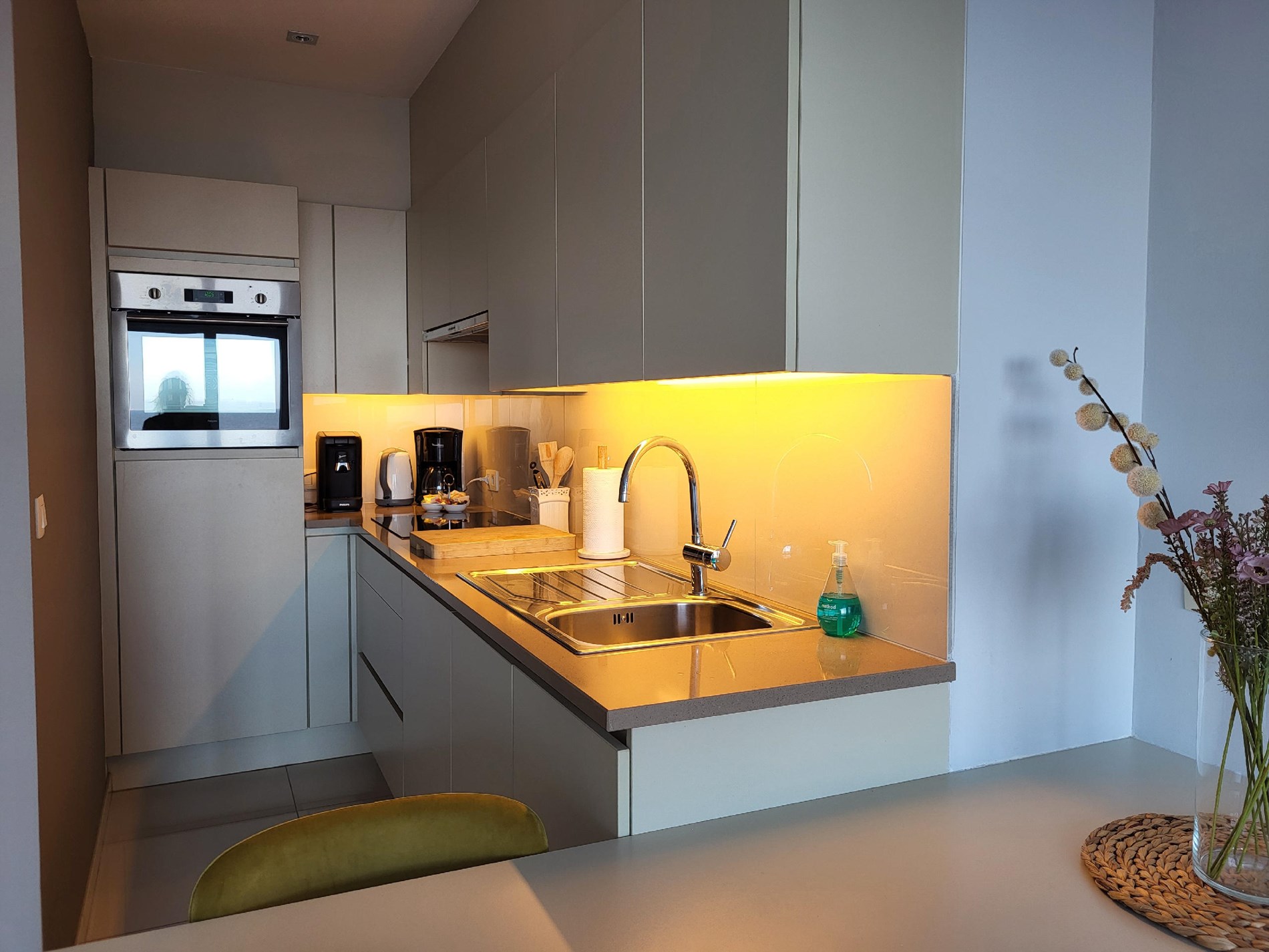huisdieren niet toegelaten, woonkamer, open keuken, koffiezet, senseo, elektrische kookplaat, oven, koelkast met vriesvak, vaatwasmachine, apart toilet, geocode.0.6.2 (mariakerke), stofzuiger, niet-rokers, tv, wifi, badkamer, divanbed 2 pers., wc, donsdeken 2 personen, zeezicht, digibox, instapdouche met regendouche, netflix
