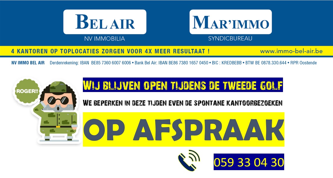Tijdens de tweede golf blijven we werken zolang dit is toegestaan. Spontane kantoorbezoeken worden wel even geweerd teneinde de contacten tot een minimum te herleiden. We werken wel op afspraak. Bel ons dus gerust op de vertrouwde nummers en email adressen.